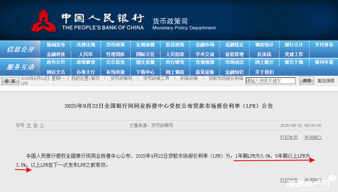 央行發布最新公告,2025年9月22日貸款市場報價利率,1年期LPR為3.0%,5年期以上LPR為3.5%,與上月維持不變。