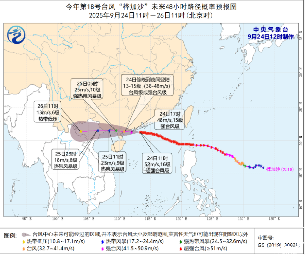 預計“樺加沙”將以每小時20公里左右的速度向西偏北方向移動將于24日傍晚到夜間在廣東陽江到湛江一帶沿海登陸(臺風級或強臺風級13-15級,38-48米/秒)登陸后穿過雷州半島進入北部灣之后向西偏南方向移動趨向越南北部,強度逐漸減弱