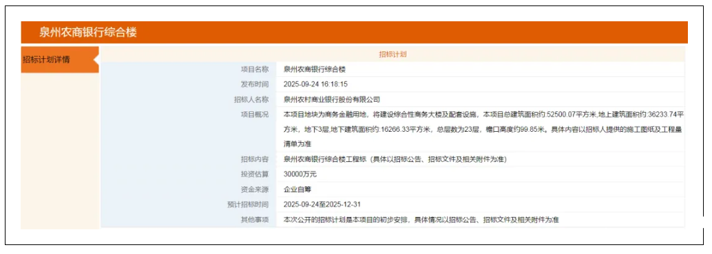 近日,泉州市公共資源交易信息網發布《泉州農商銀行綜合樓》招標計劃,項目離開工建設更近一步。