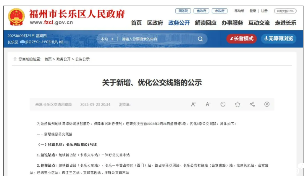 2025年9月23日,福州市長樂區交通運輸局發布“關于新增、優化公交線路的公示 ”。為做好福州地鐵濱海快線接駁服務,保障市民出行便利。經研究決定自2025年9月26日起新增3條、優化8條公交線路。