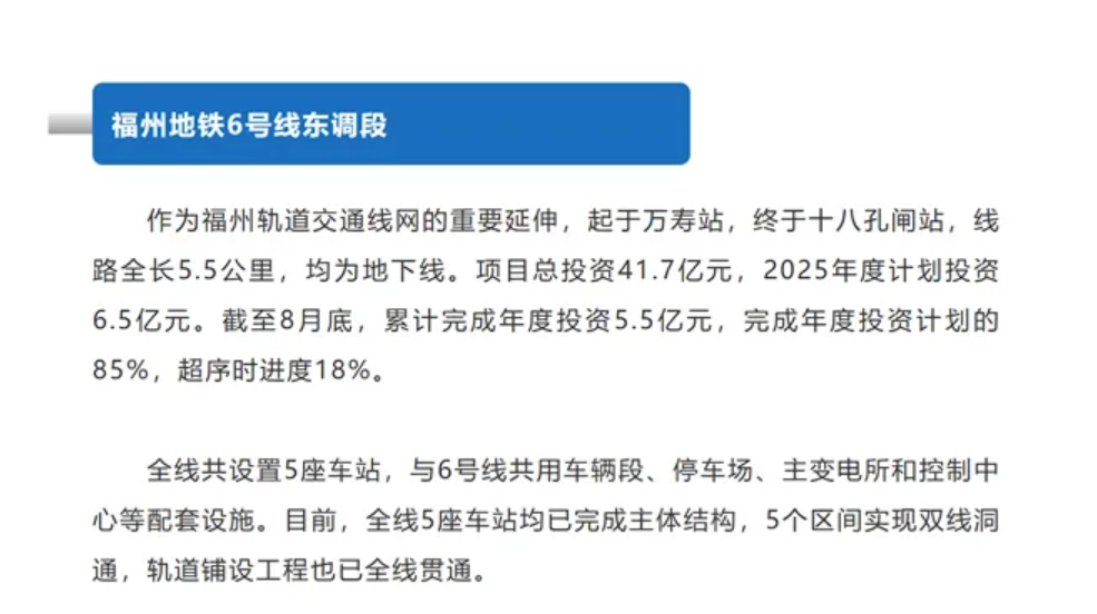 地鐵6號線東調段工程項目總投資41.7億元,2025年度計劃投資6.5億元。截至8月底,累計完成年度投資5.5億元,完成年度投資計劃的85%,超序時進度18%。
