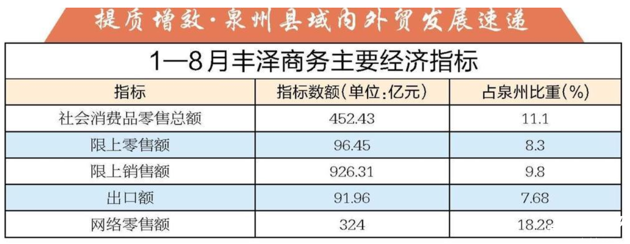 今年1—8月,豐澤區完成社會消費品零售總額452.43億元,占全市比重11.1%;限上零售額完成96.45億元,占全市比重8.3%,網絡零售額324億元,比增16.8%,占全市18.28%,外貿出口91.96億元,占全市比重7.68%。