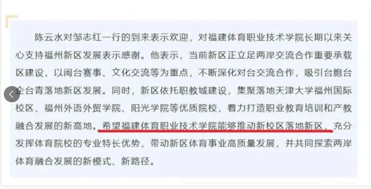 2024年9月26日,時任福州市委副書記、福州新區黨工委書記陳云水,福州新區黨工委副書記、管委會主任蘭文會見福建體育職業技術學院黨委書記鄒志紅、院長石智勇一行,雙方就推動福建體育職業技術學院落地新區、探索兩岸體育融合發展新路等事項進行深入交流。