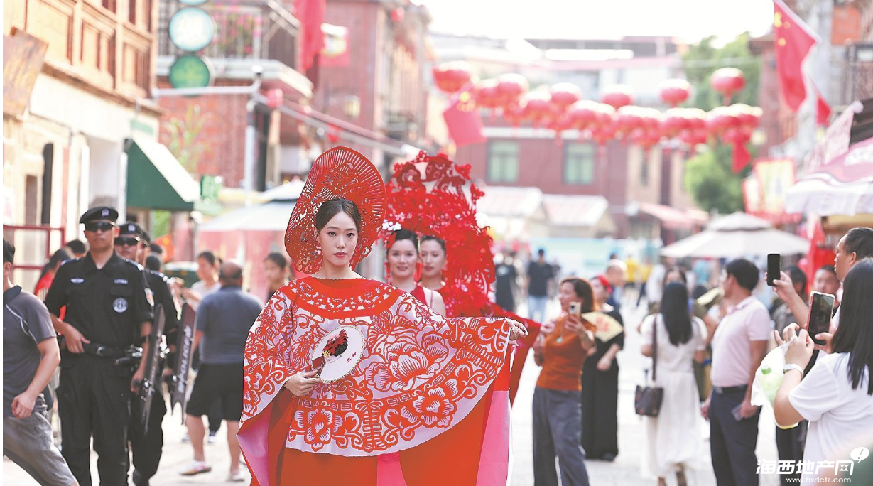 10月6日晚,泉州洛陽橋橋南古街迎來一場跨越千年的文化對話。由泉州市民間文藝家協會主辦,泉州市青年攝影家協會、剪紙藝術專委會聯合承辦的“非遺剪紙時裝秀”在暮色中驚艷亮相,將傳統剪紙藝術與現代服飾設計完美融合,為這座世遺城市再添文化新景。 (融媒體記者陳英杰 攝)
