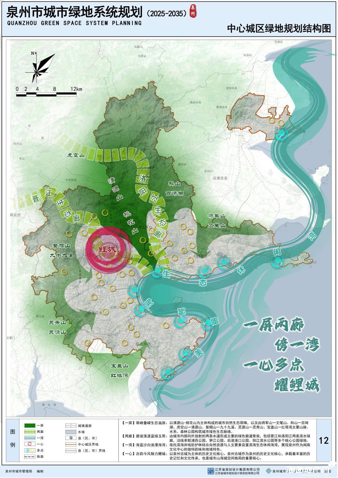 該規劃期限2025—2035年,規劃范圍市域11015平方公里、中心城區1445.55平方公里。規劃錨固泉州自然山水格局,構建生態安全屏障,加強城市“綠線”管控,完善城市綠地布局,以期形成“一屏、兩廊、一灣、一心、多點”的綠地結構。