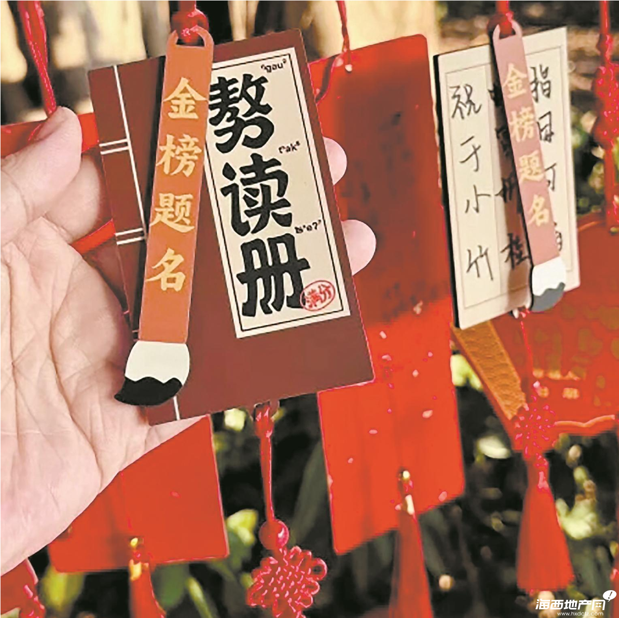 作為泉州22處世界遺產點之一,泉州府文廟不僅有著宋元州府級文廟的高規制,更以拜孔子、領紅蛋、行開筆禮等活動賡續文運亨通的祝福。此次府文廟點位的販售機內,刺桐花與滴水獸書簽、城市字繪冰箱貼等文創產品錯落陳列,最受關注的當數祈福牌——正面印著“敖讀冊”書籍與“金榜題名”狀元筆圖案,承載文星高照的美好寓意;背面可書寫心愿,狀元筆還能拆卸作為日常書簽,為莘莘學子送上學業加持的文化祝福。