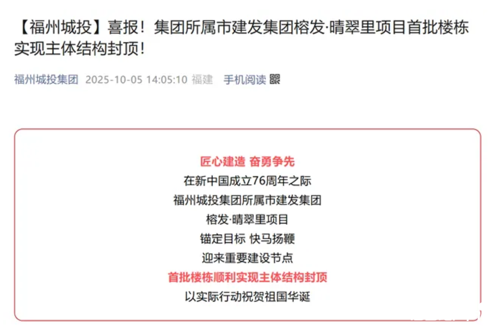 10月5日,福州城投集團對外透露,榕發·晴翠里項目迎來重要建設節點,首批樓棟(5號樓、6號樓)順利實現主體結構封頂。