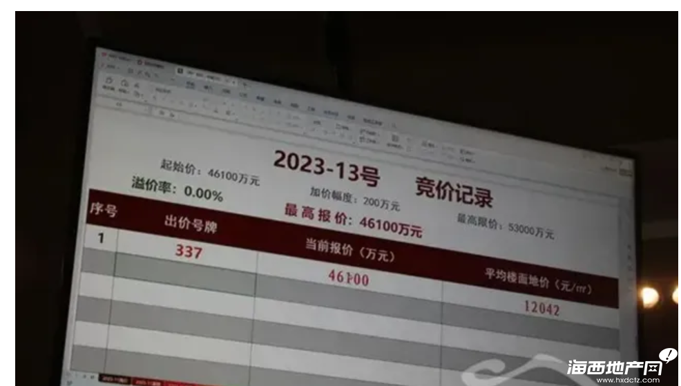 海西房產網(微信公眾號:fjhxfcw)通過查詢福州土地拍賣記錄獲悉,2023年9月1日,經過1輪競價,337號競買人福建榕發置地有限公司以4.61億競得福州宗地2023-13號,樓面地價12042元/㎡。