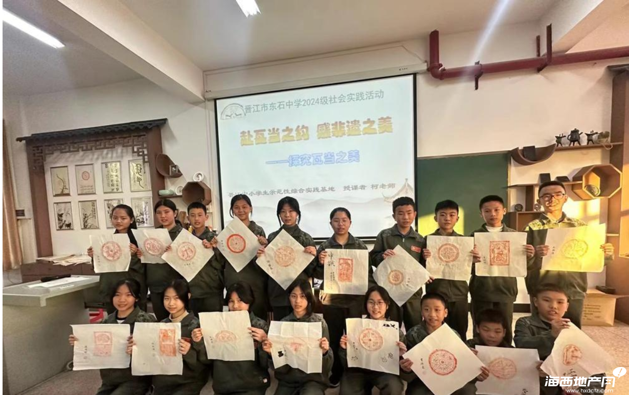 晉江市東石中學的學生在“瓦當探究課”展示瓦當拓印藝術作品