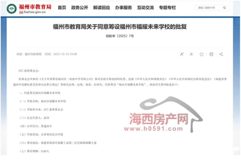 10月10日,福州市教育局發布“關于同意籌設福州市福耀未來學校的批復(榕教審〔2025〕7號)”。
