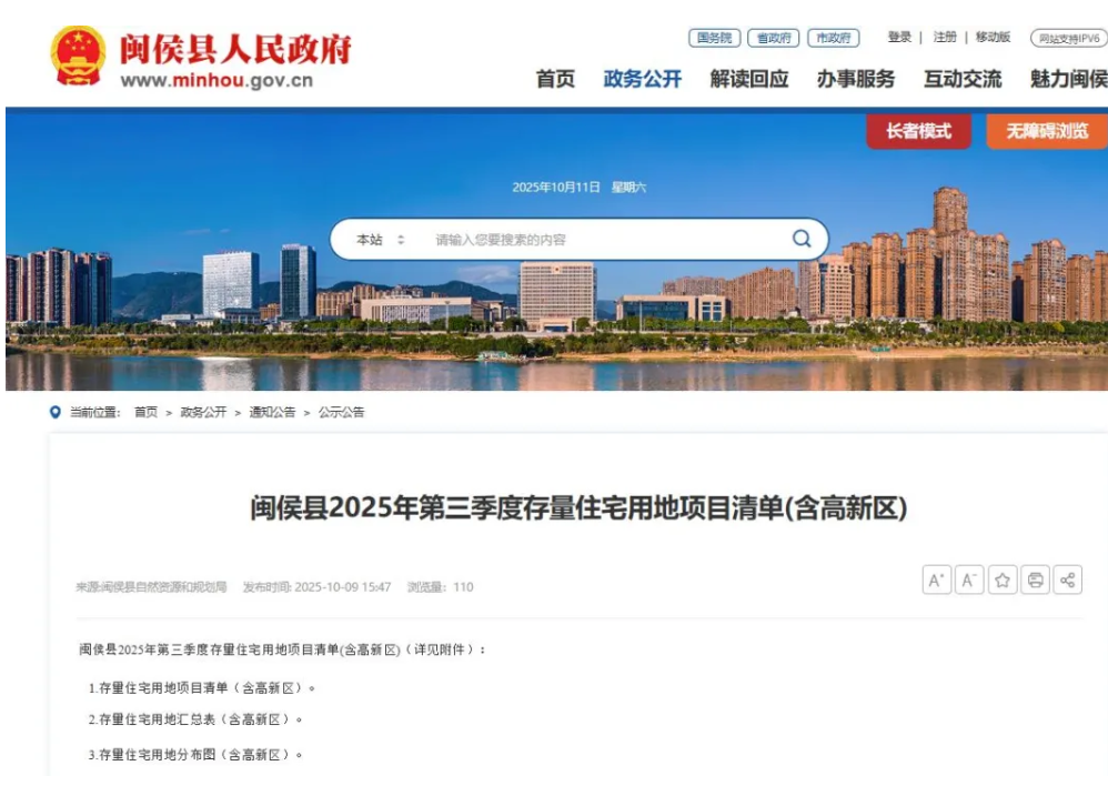 2025年10月9日,閩侯縣自然資源和規(guī)劃局發(fā)布“閩侯縣2025年第三季度存量住宅用地項(xiàng)目清單(含高新區(qū)) ”。