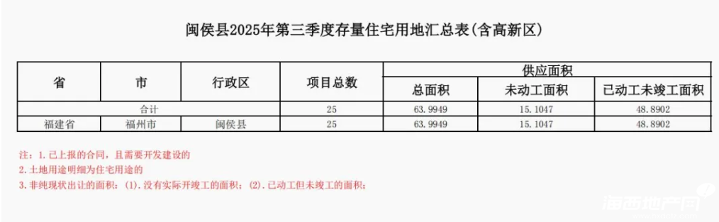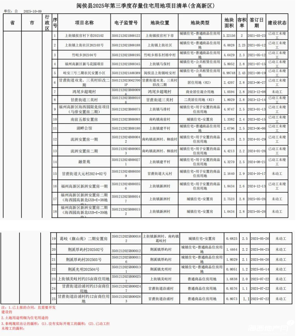閩侯縣2025年第三季度存量住宅用地匯總表(含高新區(qū))顯示,項(xiàng)目共有25個(gè),總面積63.9949公頃(折合959.92畝),未動(dòng)工面積15.1047公頃,已勸工未竣工面積48.8902公頃。
