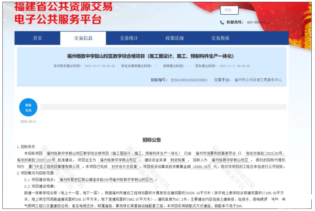 本次招標范圍包括福州格致中學鼓山校區教學綜合樓項目施工圖設計、施工、預制構件生產一體化的工程總承包任務。招標最高限價金額為13580.9217萬元。