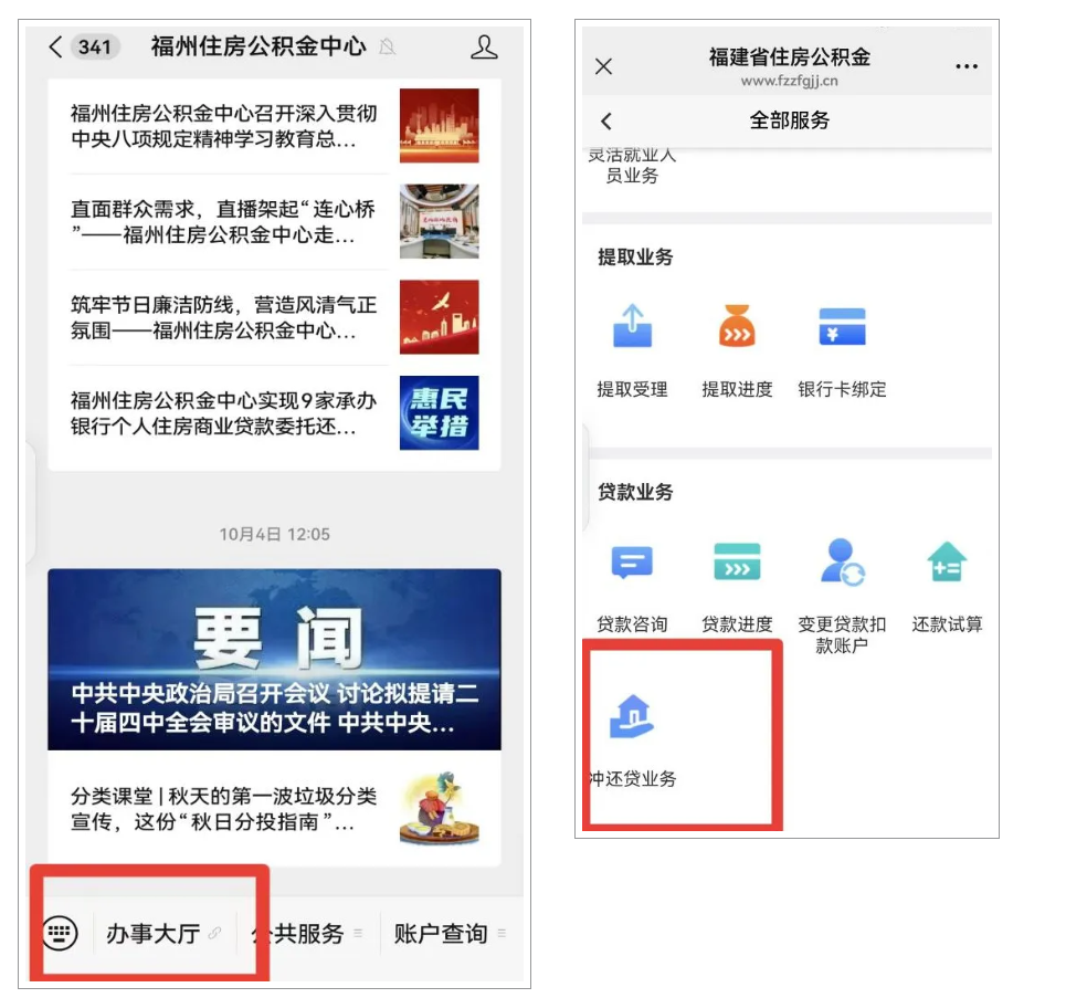 ①登錄微信公眾號——點擊右下角“辦事大廳”——選擇“全部服務”——點擊“沖還貸業務”