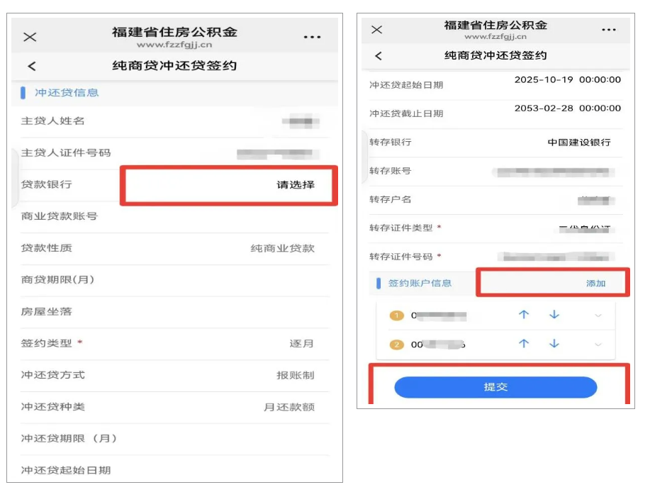 ③選擇“貸款銀行”——填寫“商業貸款賬號”——“簽約賬戶信息”點擊“添加”公積金賬戶(有補貼戶需重復此步驟)——賬戶添加完畢確認無誤,點擊“提交”