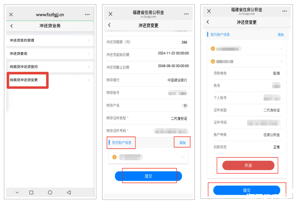 (2)委托還貸變更(主借款人配偶或主借款人可通過“添加”或“作廢”公積金或補貼賬戶完成增員或減員操作)