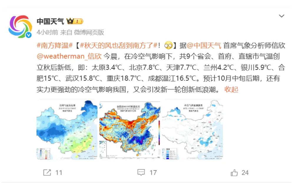 據中國天氣首席氣象分析師信欣在冷空氣影響下共9個省會、首府、直轄市氣溫創立秋后新低預計10月中旬后期還有實力更強勁的冷空氣影響我國又會引發新一輪創新低浪潮