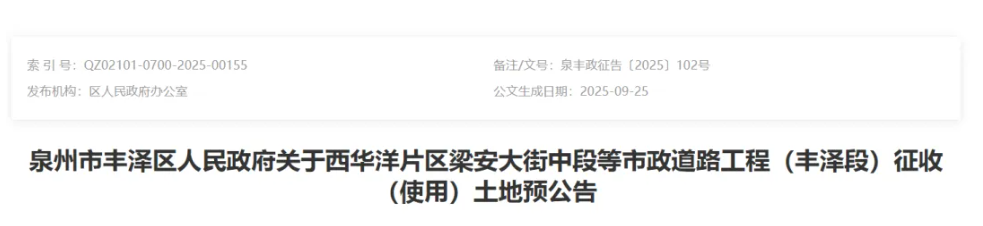 為實(shí)施泉州市豐澤區(qū)國民經(jīng)濟(jì)和社會發(fā)展規(guī)劃、泉州市國土空間規(guī)劃,根據(jù)《中華人民共和國土地管理法》等法律法規(guī)的規(guī)定,現(xiàn)發(fā)布西華洋片區(qū)梁安大街中段等市政道路工程(豐澤段)征收(使用)土地預(yù)公告: