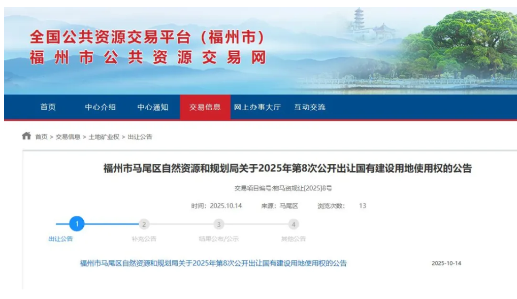 2025年10月14日,福州市馬尾區自然資源和規劃局發布“關于2025年第8次公開出讓國有建設用地使用權的公告”。
