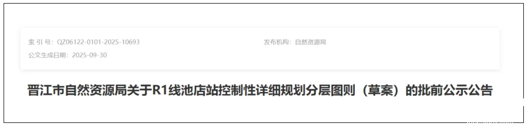 晉江自然資源局發布關于R1線池店站控制性詳細規劃分層圖則(草案)批前公示公告▼