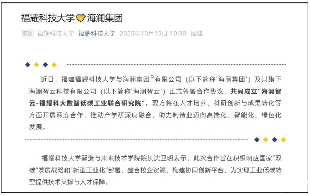 據“福耀科技大學”10月15日報道,近日,福建福耀科技大學與海瀾集團有限公司(以下簡稱‘海瀾集團’)及其旗下海瀾智云科技有限公司(以下簡稱‘海瀾智云’)正式簽署合作協議,共同成立“海瀾智云-福耀科大數智低碳工業聯合研究院”。
