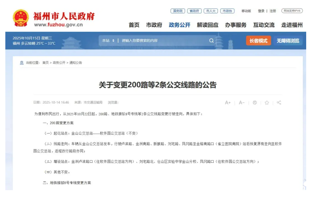 2025年10月14日,福州市道路運輸事業發展中心發布“關于變更200路等2條公交線路的公告 ”。