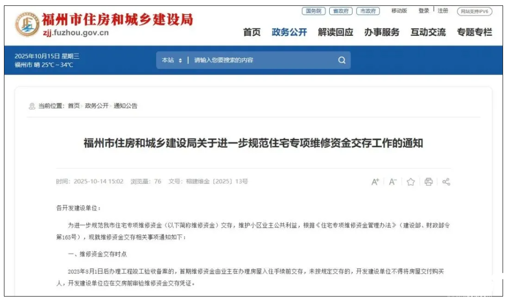 2025年10月14日,福州市住房和城鄉建設局官網發布“關于進一步規范住宅專項維修資金交存工作的通知”。