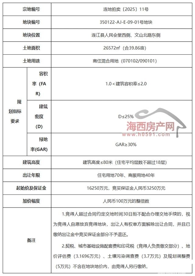 出讓公告顯示,連地拍賣〔2025〕11號,地塊位于連江縣人民會堂西側、文山北路東側,土地用途為商住混合用地。