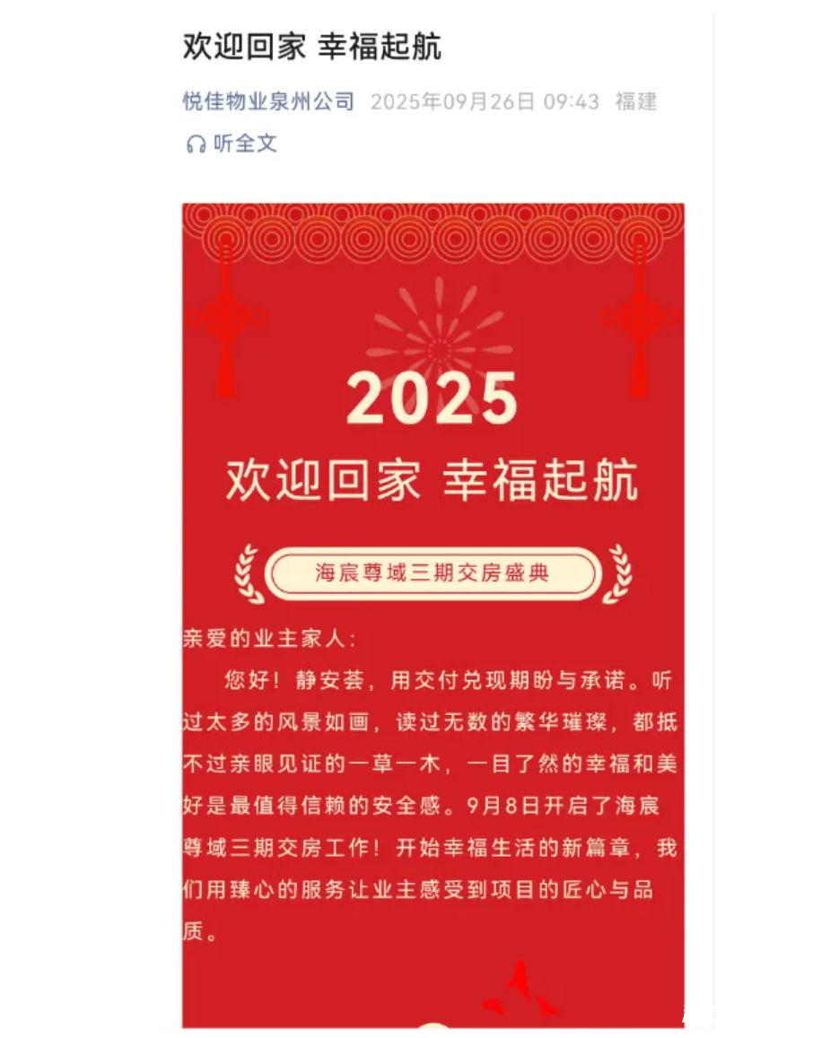 近日,悅佳物業(yè)泉州公司發(fā)布海宸尊域三期已于9月8日開始交房。